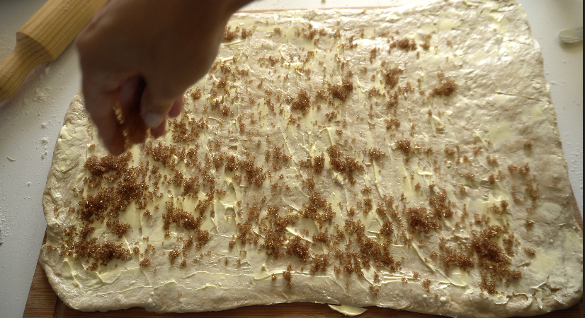 - Spalma il burro vegano su tutta la superficie con una spatola. Mescola zucchero e cannella e cospargi uniformemente. Arrotola l’impasto partendo dal lato lungo, fino a ottenere un salsicciotto.