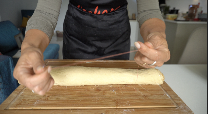 - Usa un filo di cotone per tagliare i rolls senza schiacciare l’impasto: infila il filo sotto il rotolo, incrocia le estremità e stringi. In alternativa, usa un coltello a seghetto con delicatezza.