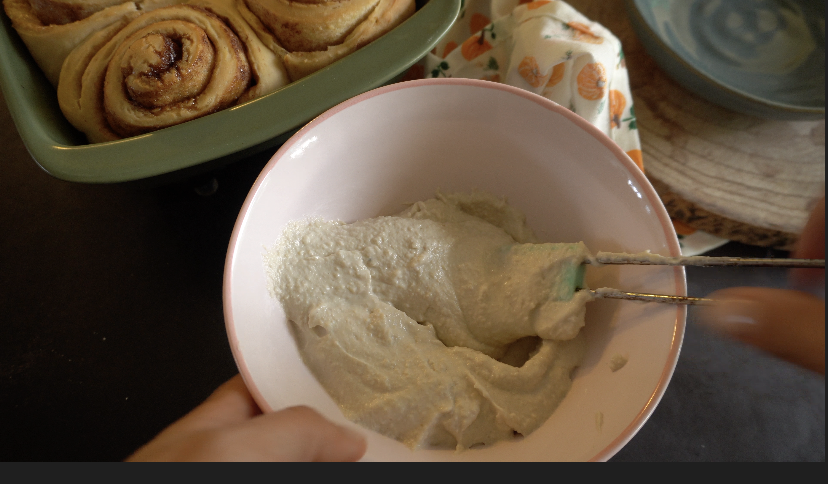 - Una volta freddi, spalma generosamente il frosting sopra i cinnamon rolls.