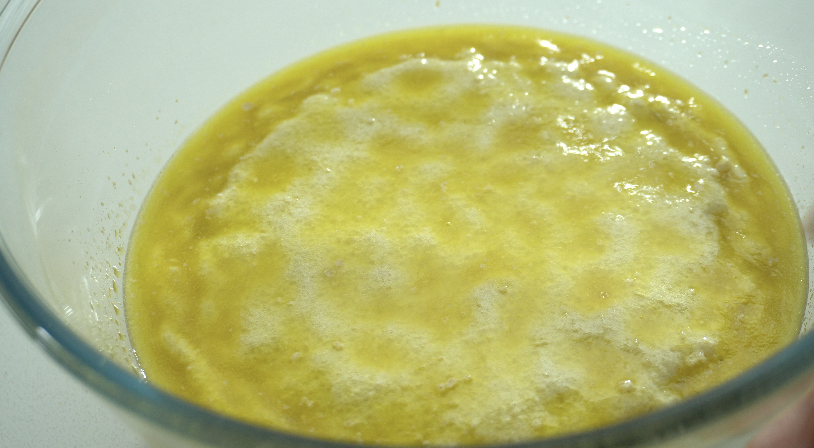 - Sciogli il burro e pesalo. Versalo in una ciotola insieme allo zucchero e al latte di soia tiepido. Controlla la temperatura: se è troppo calda, rischia di uccidere il lievito. Aggiungi il lievito, mescola e lascia riposare circa 10 minuti. Quando si forma una leggera schiuma in superficie, significa che il lievito è attivo.