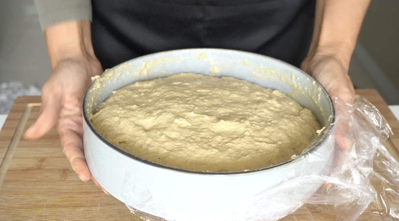 In una ciotola capiente unisci la farina e il sale. Versa al centro i liquidi con il lievito e mescola con una spatola fino a ottenere un impasto grossolano. Copri con un panno o pellicola e lascia lievitare fino al raddoppio del volume (circa 1 ora, ma puĂ² variare in base alla temperatura ambiente). - Seconda lavorazione