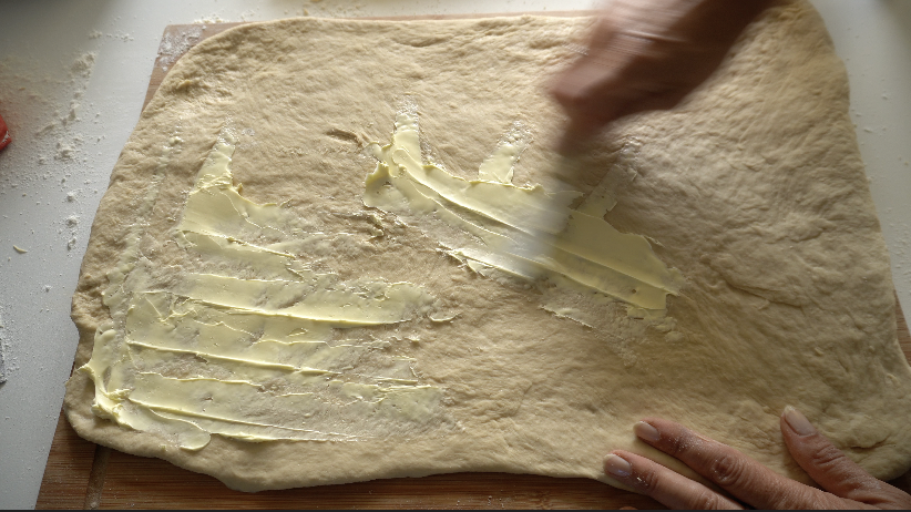 Stendi l'impasto forma un rettangolo e cospargi con il burro