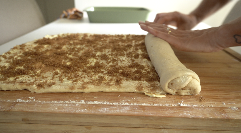 Spalma il burro vegano su tutta la superficie con una spatola. Mescola zucchero e cannella e cospargi uniformemente. Arrotola l’impasto partendo dal lato lungo, fino a ottenere un salsicciotto. - Taglio dei rolls
